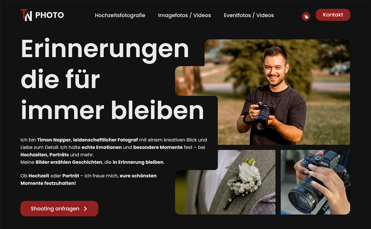 2025 erhielt der Hochzeitsfotograf Timon Nopper eine neue, benutzerfreundliche Website, die seine Angebote klar und ansprechend präsentiert und seine Spezialisierung auf hochwertige Hochzeits-, Image- und Eventfotografie unterstreicht.